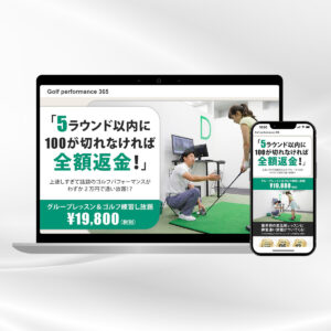 全額返金の文字を大きく表示することで、安心感と信頼感を表現、高品質レッスンによりゴルフがしっかり上達できるイメージを想起させています。